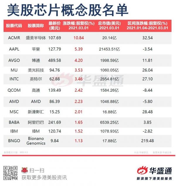此外,3月1日,美股市场的芯片概念股也小幅上涨,盛美半导体涨超10%、英特尔涨3.46%、AMD涨2.23%。