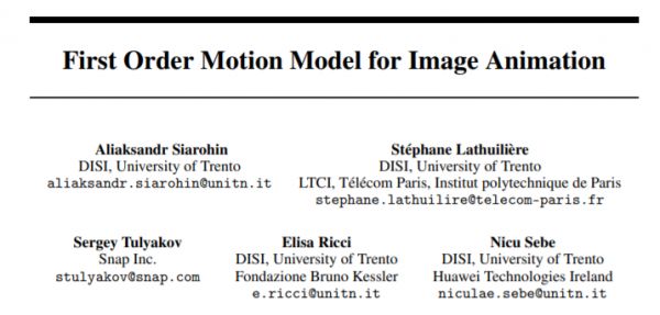 这个特效的背后主要是FOMM(First Order Motion Model)技术方案,主要是根据去年意大利特伦托大学的一项研究,论文入选了NIPS 2019。