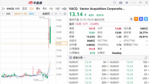 在消息公布后,VACQ股价表现较为强势,昨日小幅回调,站稳13美元大关。