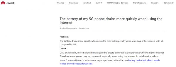 华为在一个支持页面告诉用户,在使用5G网络时(尤其是在观看在线视频时),电池的耗电速度要比使用4G网络快得多。