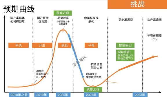 最后是朱格拉周期,也叫资本资出的设备投资周期,在中国还叠加了国产替代的周期,现处于刚开始的阶段。毫无疑问,这三个周期都有利于半导体产业的发展。国产替代周期更是将给国内半导体厂商带来前所未有的发展机遇,但这个机遇在半导体板块的体现并不是简单的股价拉升,虽然势头总体向上,但其利好的是各赛道的龙头企业,而高估值、高溢价的企业则会回落。