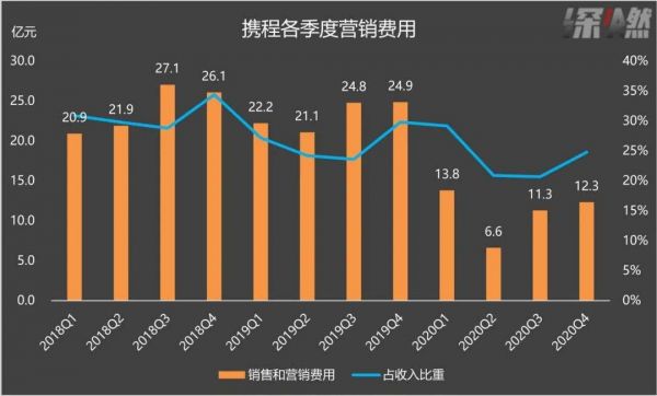 另外携程也在压缩成本开支。从财报中可以看到,2020年携程的营销费用大幅缩减。2018年和2019年的连续8个季度里,携程的营销费用都在20亿元以上,在收入中的占比在30%左右。但是从2020年一季度开始,营销费用降至20亿元以下,全年单季度平均11亿元。