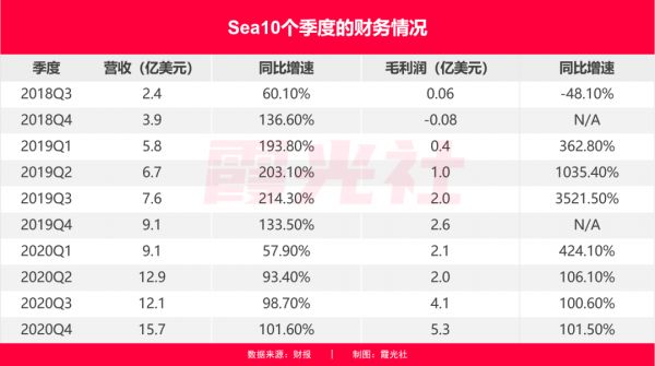 驱动Sea股价飙升的关键是其业绩的飞涨。美东时间3月2日,Sea Limited发布了2020年Q4及2020年全年财报。财报显示,公司2020年Q4营收达15.7亿美元,同比增长101.6%,毛利率为5.3亿美元,同比增长101.5%。这样的数据意味着,Sea已连续多个季度保持超高速增长。