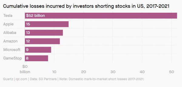 不过,对特斯拉的长期看空者而言,以上因素只是诱因。他们始终认为,特斯拉股价与基本业务面相比,原本就过高,必然要回调。多年来,卖空者一直对从暴跌的特斯拉中赚钱的前景垂涎三尺,但绝大多数人没等到这一天就举起白旗、平仓离场了。S3 Partners的数据显示,2017年至2021年之间,特斯拉空头损失了520亿美元;若回溯到2010年,这个数字接近570亿美元。
