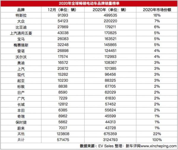 据EV Sales网站公布的全球电动汽车(乘用车)销量数据,在全球汽车销量同比下降14%的背景下,2020年全球电动汽车逆势上涨41%,销量达到312.5万辆。