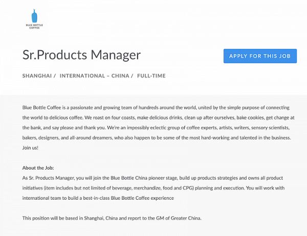 近日,蓝瓶咖啡官网上更新了一则高级产品经理的招聘信息,信息显示招聘人选将加入“蓝瓶中国”的开创阶段,能参与所有产品(项目包括但不限于饮料、商品、食品和CPG)的计划和执行。该职位将设在中国上海,并向大中华区总经理汇报。