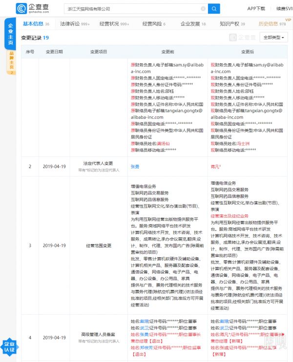 企查查数据显示,4月19日,浙江天猫网络有限公司发生多项工商变更,阿里巴巴集团首席执行官、阿里巴巴集团董事局董事张勇卸任法定代表人以及董事长兼总经理职务,改由蒋凡接任,阿里巴巴集团首席风险官郑俊芳(监事)退出,新增张彧 (监事),同时经营范围新增演出及经纪业务。