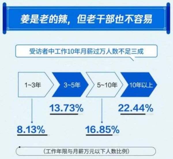4月23日,腾讯理财通、腾讯金融科技智库与腾讯网企鹅智库联合发布了《2019国人工资报告》,显示了居民工资理财行为与变迁。据报告显示,工作10年以上的受访者中月薪过万人数比例仅为22.44%。也就是说,近8成人工作10年月薪没过万元。