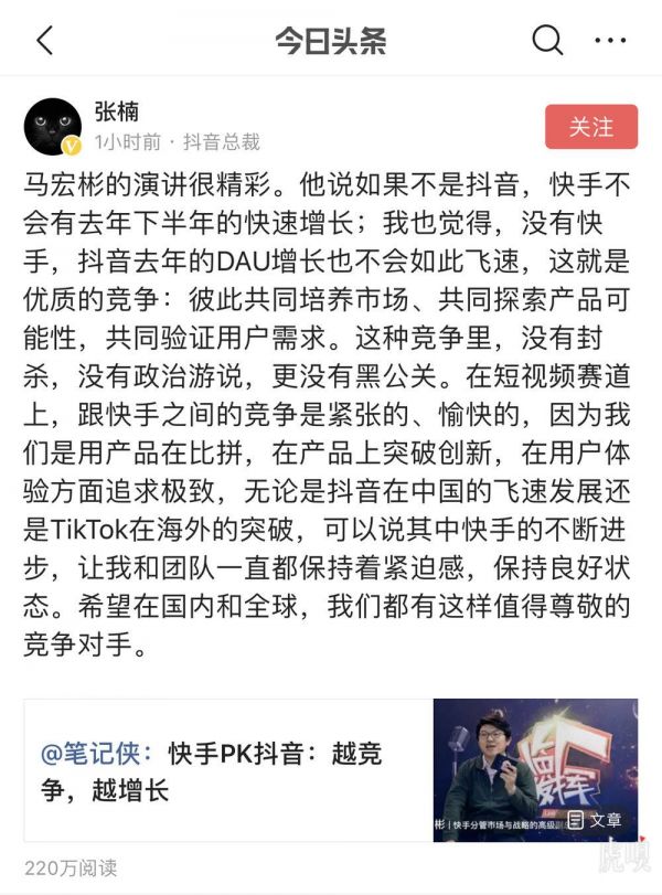 今天,抖音总裁张楠称,“没有快手,抖音去年的DAU增长也不会如此飞速,这就是优质的竞争。这种竞争里,没有封杀,没有政治游说,更没有黑公关。在短视频赛道上,跟快手之间的竞争是紧张的、愉快的。无论是抖音在中国的飞速发展还是TikTok在海外的突破,可以说其中快手的不断进步,让我和团队一直都保持着紧迫感,保持良好状态。”