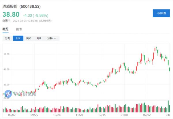 通威股份再次大跌,封死跌停,其股份较2月10日创出的55.5元历史峰值已跌超30%,两天市值蒸发362亿元。另外,通威股份全天成交97.5亿元,这一成交额为该股历史最高成交金额。