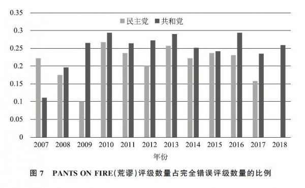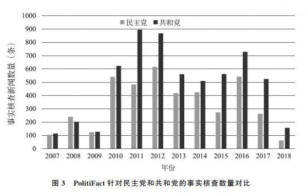 在绝大多数年份,PolitiFact针对共和党的事实核查要多于民主党,这一现象在2012年和2016年选举周期前后更为明显,在2015—2018年,针对共和党的事实核查数量几乎是民主党的两倍。