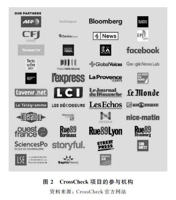 First Draft作为一个事实核查新闻联盟,并不直接开展事实核查,而是利用其影响力和关系网络组织多家媒体或事实核查机构共同展开一些事实核查项目。其中一个典型项目是法国大选期间开展的CrossCheck项目。CrossCheck项目由谷歌新闻实验室和FirstDraft共同发起,关注并核查法国大选期间社交媒体上的虚假新闻。法新社、BuzzFeed News、法国《世界报》、法国电视台、Storyful等34家组织参与其中(所有参与机构见图2)。CrossCheck项目的事实核查呈现出人工核查与技术核查相结合的特点,该项目根据Google Trends提供的数据以及各合作组织记者查阅的内容确定需要核查的内容,Facebook、CrowdTangle和其他技术公司通过AI算法识别文章中的主要事实以加快人工核查的速度。重要的事实核查结果能够通过各个合作机构实现门户网站、电视台、广播、纸媒、社交媒体全网推送,形成广泛传播。