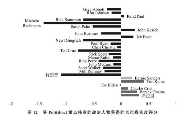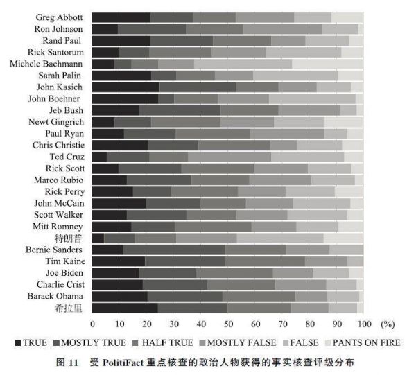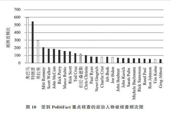 在PolitiFact 12年来的事实核查中,有26位政治人物受到50次以上的事实核查,其中民主党有5人,共和党有20人,还有一位是无党派人士伯尼·桑德斯(见图10,其中空心柱为民主党人,实心柱为共和党人)。显然,活跃的共和党人受到的事实核查比民主党人更为频繁。