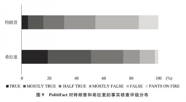 由于特朗普和希拉里在美国政坛活跃时间的差异,为避免不相关变量的干扰,本研究对特朗普和希拉里事实核查新闻的研究限定在2015年之后。2015年至今,PolitiFact对希拉里展开了199次事实核查,对特朗普展开了532次事实核查,这一数字是希拉里的2.7倍。本研究对特朗普和希拉里获得的真实性评级进行了统计,结果如图9所示特朗普获得的错误评级要大大高于希拉里。希拉里获得的真实度平均分为0.28,特朗普获得的真实度平均分为-1.08,这个数字代表的真实度评级介于基本错误和完全错误之间。