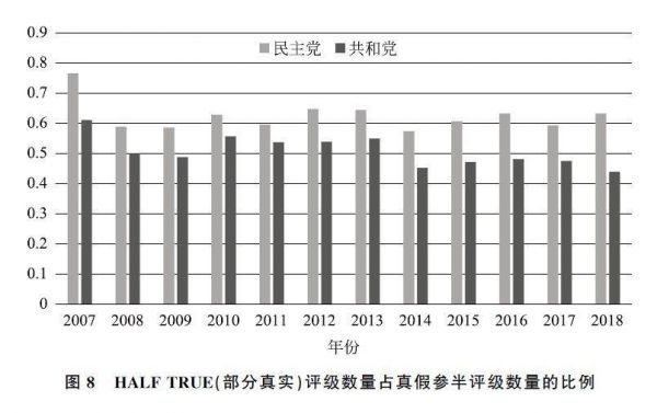 因此,本研究统计了在完全错误的言论中荒谬评级的比例,以及在有真有假的言论中半真半假的比例,即PANTS ON FIRE评级数量占FALSE和PANTS ON FIRE评级数量总和的比例(见图7),与HALF TRUE评级数量占HALF TRUE和MOSTLY FALSE评级数量总和的比例(见图8),并对共和党与民主党的数据进行对比。