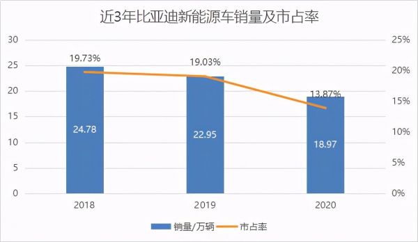 根据中国汽车工业协会数据,2020年全国汽车销量2531.1万辆,同比下降1.9%,新能源汽车销量136.7万辆,较2019年增长10.9%。比亚迪与汽车业整体行情走势正好反了过来。2020年,比亚迪燃油车销量23.73万辆,同比增长2.32%;新能源车销量18.97万辆,同比下降17.35%。