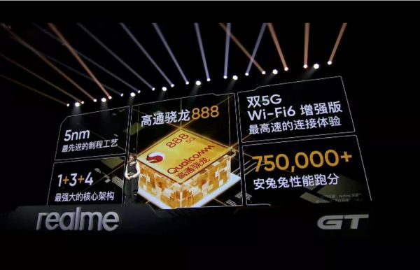 realme GT搭载了高通今年的新芯片骁龙888,这颗芯片采用了5nm的制程工艺,算例、GPU能力和架构能力相比上一代的骁龙875都有所升级。