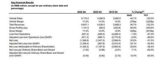 2021年3月2日,蔚来发布了2020年Q4季度及全年业绩报告。报告显示,Q4季度蔚来共交付车辆1.7万余台,同比增长111%,汽车销售收入达61.7亿元人民币(9.462亿美元),占总收入的93%。2020年全年蔚来共计交付车辆总量达4万余台,相比2019年增长了113%,全年营收达到162.6亿元,同比增长107.8%。