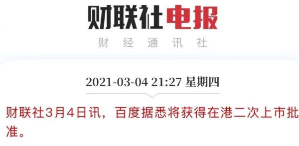 3月4日晚,财联社等多家媒体报道称,“百度将获得在港二次上市批准”。