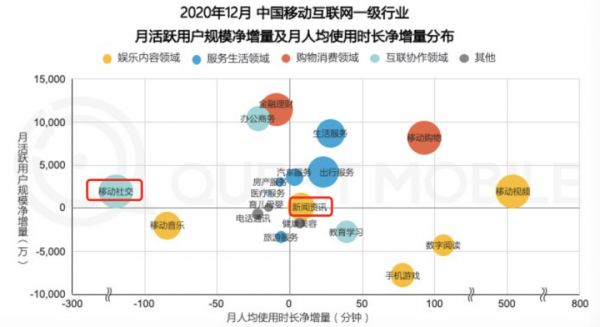 再说社交和资讯行业,这两个行业也面临着极其激烈的竞争,根据Questmobile的数据,在大盘的挤压下,移动社交和移动资讯的用户增量和时长增量在整个行业版图中并不靠前。