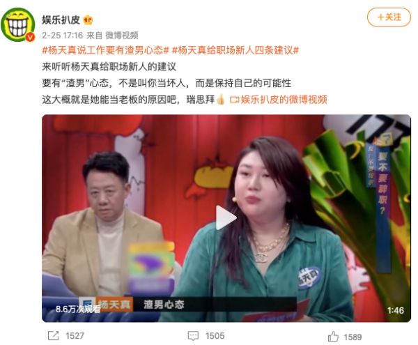 “请杨天真他们来确实有一定的效果,但是选手观点角度输出量级不够。举个例子,辩题是#作为职场新人老板不喜欢我要辞职吗#,他们能给到观众什么?是辞职还是不辞职?从一个care领导喜不喜欢自己的人,变成一个不care的人?本季大部分选手不是没有观点,而是角度太平凡,无法提供持续新奇的观察世界的角度。”胖丁吐槽。