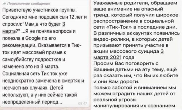 ● 社交网络上出现的警告信息两则,左侧为一位担忧的母亲发给家长群的短信,其中称“TikTok已经不止一次地出现在死亡和不幸事件中,孩子们被利用了……”右侧为学校发给家长的警示消息,要求家长与孩子就这一问题进行谈话 / 网页截图