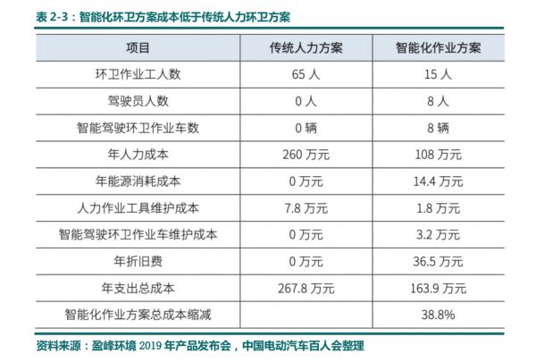 在降本增效的实际成果方面,以盈峰环境 2019 年产品发布会上给出的湖南省长沙市某项目为例,该区域为居民区,包含背街小巷、学校等多种作业场景,以往采取纯人力作业方案,需要 65 名工人;引入 8 辆智 能小型环卫机器人装备后,仅需要 15 名环卫工人和 8 名安全员。整个作业队伍人员缩减了 64.6%,年度综合成本降低了 38.8%。
