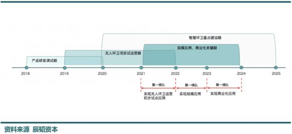 报告认为,2021-2024年将是无人环卫规模化、商业化应用的关键期,自2022年起,自动驾驶环卫车的综合成本将低于人工驾驶环卫车,无人环卫将达到商业化落地的拐点。2025年,自动驾驶技术、无人环卫运营将更加完备成熟,相关法律法规将相对完善。届时,无人环卫将实现大规模商业化应用。