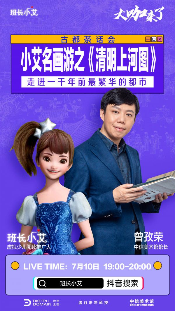 去年7月,班长小艾联合中信美术馆进行了一系列名为“古都茶话会”的系列直播,她带领小朋友们重新解读了《清明上河图》《韩熙载夜宴图》等三幅经典画作。在虚拟人惟妙惟肖的讲解以及与真人专家的实时互动中,很多晦涩或易被疏忽的细节被重新发掘出来并得到了有趣的诠释。