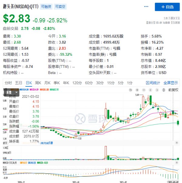 财报资料显示,2020年Q4趣头条实现营业收入13亿元,相比较于2019年同期的16.58亿元同比下降21%,虽然实现了单季度经营性盈利4250万元,但是各项核心数据都在大踏步下滑。糟糕的业绩数据直接反映在公司股价上,3月4日趣头条的单日股价暴跌25.92%,收于2.83美元/股。