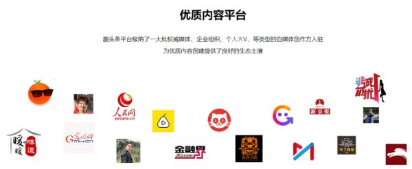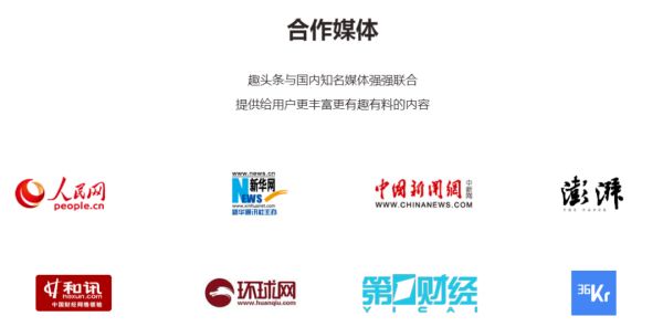 为了逐步树立“优质”形象,趣头条重点打出权威和大V品牌。在官网首页,赫然列出人民网、光明网等官媒,以及金融界、梨视频等知名作者的名号,合作媒体也都是社会、财经、国际类头部媒体。