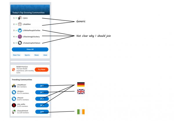 这个页面的可怕程度令人发指,因为只需要花一点点时间就可以让它变得更好了。为什么不给我展示跟我所注册的社区相似的社区?(并在文案里面提一下)。或者展示跟我互动过的人所属的subreddit?