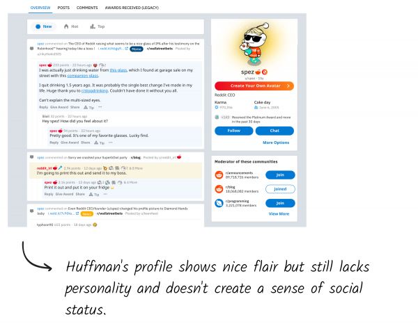 不过,这也是Reddit之所以独特的部分原因所在。匿名帐户可以分享吸引人的花边新闻而不受惩罚。但是,为了鼓励名人使用(并鼓励能让社交媒体发挥作用的社会竞争),Reddit需要提升个人档案的地位。我们不妨看看Huffman的个人资料,u / spez :