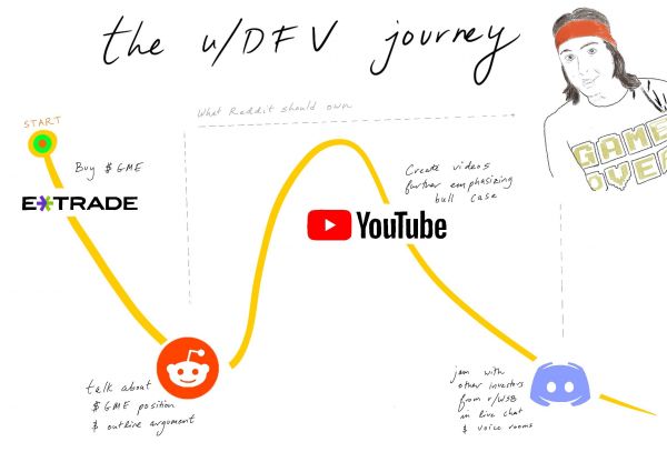 就以u/DeepFuckingValue(DFV)这样的人为例,此人是游戏驿站轧空头者的核心。为了传播福音,他的用户旅程是什么样的呢?