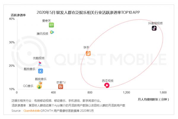 QuestMobile发布的《银发人群洞察报告》显示,50岁以上的银发人群占比达到1/3,这部分网民规模已经超过1亿,增速远高于全体网民。短视频是这一群体最主要的娱乐方式,相比去年,相关APP成了银发人群最得力的时间杀手。另外,在社交、资讯、网络K歌、在线阅读类APP上,银发老人的人均使用时长已经高于全网用户。