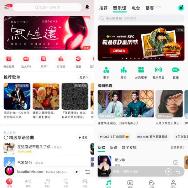 网易云音乐、QQ 音乐界面对比,左:网易云音乐 右:QQ 音乐