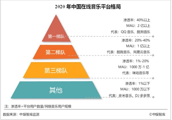 根据中娱智库数据,2020 年中国在线音乐平台中,腾讯旗下的 QQ 音乐、酷狗音乐稳占第一梯队,网易云占据第二梯队,跟它同列其中的是腾讯旗下的酷我音乐。