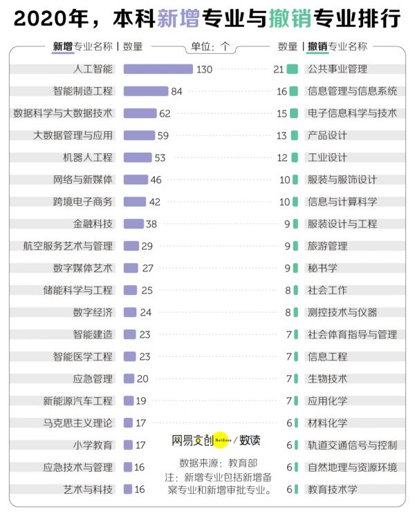 最近,教育部公布了 2020 年高校本科专业备案和审批结果。在各大高校新增设专业的同时,也有大批专业被撤销。