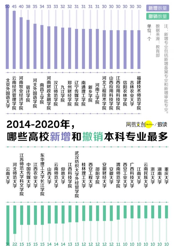 在整理了 2014-2020 年教育部发布的专业备案和审批结果后,我们发现北京外国语大学、云南经济管理学院和河南牧业经济学院新增专业最多,分别是 50 个、45 个和 40 个,而云南大学和河北师范大学撤销专业最多,分别为 31 个和 22 个。