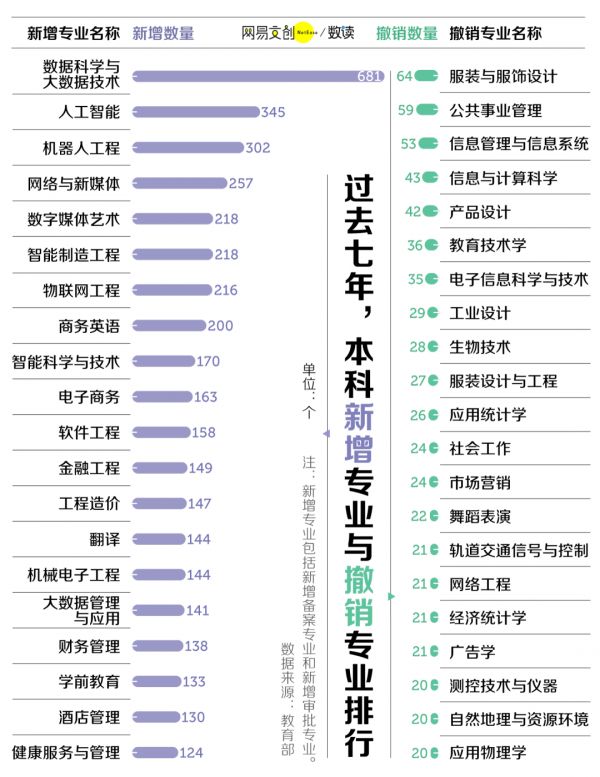 除了工学专业,七年间新增最多的是管理学、艺术学、理学和文学,撤销最多的学科门类也是这几个,只不过排名有些差别,分别是理学、艺术学、管理学和文学。