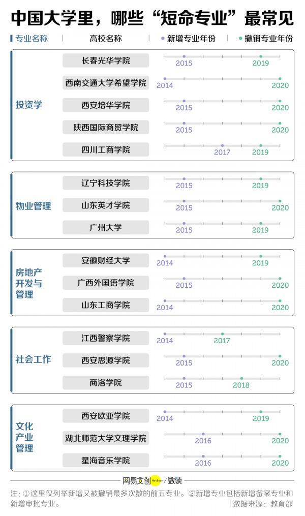 最常见的“短命专业”前五名分别是投资学、物业管理、房地产开发与管理、社会工作和文化产业管理,多个高校开设后不到 5 年便又将其撤销,最“短命”的甚至只开设了两年,还不够首届学生从入学到毕业的学习周期。