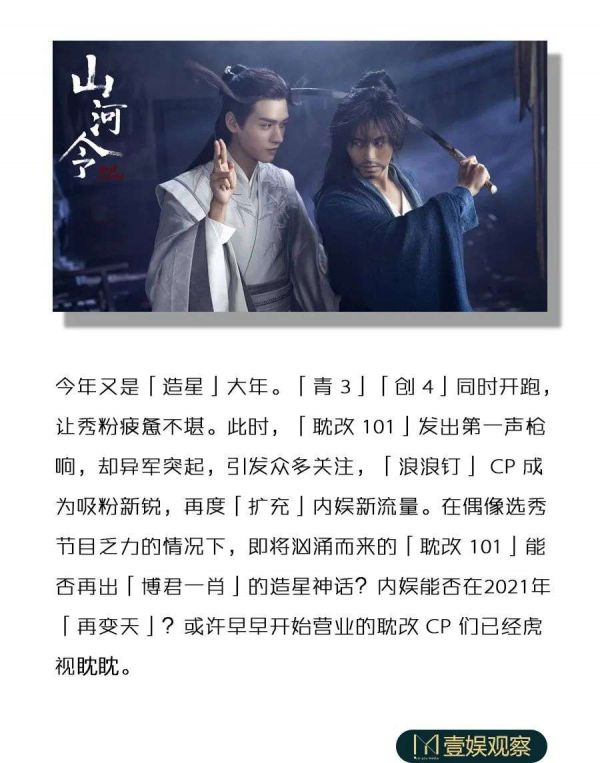 当平台偶像选秀同时上线,《山河令》错峰出行,率先拉开“耽改101”序幕,2021年有关新流量产生的话题,大概率来到了男艺人身上。