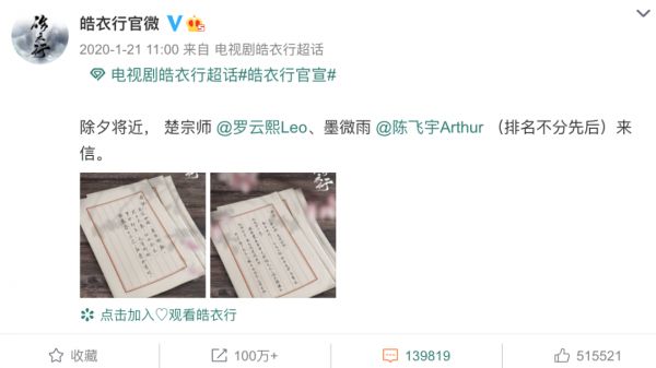 而到了《山河令》,主演们更是配合着剧情,找到了有趣、易产生好感,又能够变成梗的宣传方式。张哲瀚的微博简介写着“裸辞事业编首领”,网友惊呼是那个豁了命也要离开天窗的周子舒了;而龚俊的简介则写着“请叫我温大善人”,一句话就带出了温客行妖孽、腹黑、又乖戾的性格。