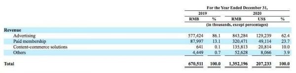招股书披露,知乎2020全年实现13.52亿元的营收,同比增长101.7%。其中,广告收入从2019年的5.77亿元,增长46%至8.43亿元,贡献了62.4%的营收。