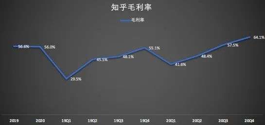招呼披露,知乎2020年度的毛利率为56%,高于2019年的46.6%。2020年四季度,毛利率为64.1%。