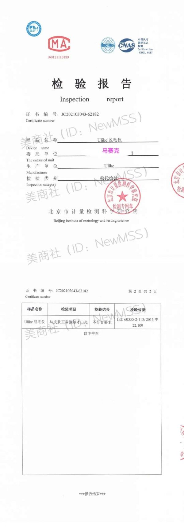 据了解,Ulike脱毛仪属于强光源产品,关于强脉冲光脱毛仪的质量要求,国家标准GB/T 36419-2018中要求参照:IEC 60335-2-113:2016标准。“北京市计量检测科学研究院”依据IEC 60335-2-113:2016的第22.109项,检验结果显示Ulike脱毛仪不符合此项国家标准。