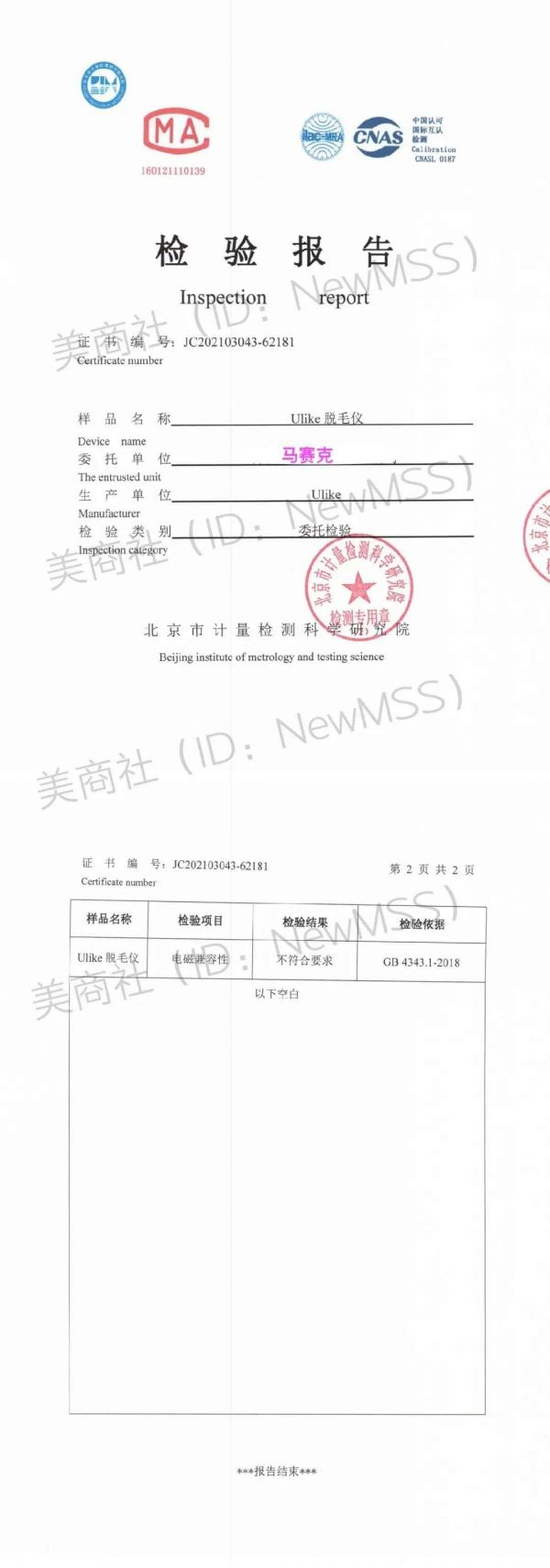 3月6日,美商社(ID:NewMSS)发布了两份由“北京市计量检测科学研究院”出具的检验报告。