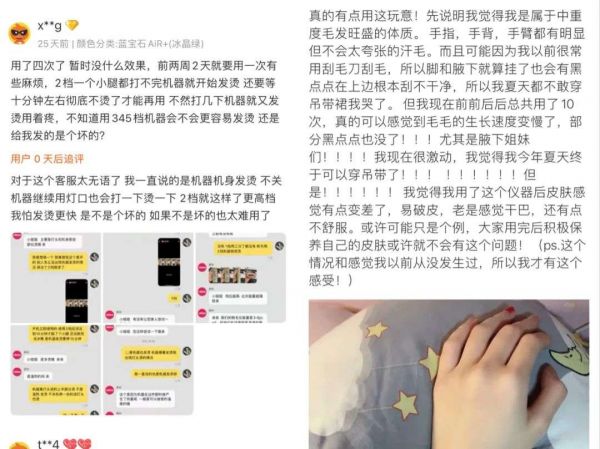 在其天猫旗舰店的评价中,有一些用户在追评里分享了自己的真实感受,光**忆表示:“我觉得我用了这个仪器后皮肤有点变差了,易破皮,老是感觉干巴,还有点不舒服,这个情况我从前从没有发生过。”x**g说:“机器机身发烫,不关机器继续用灯口也会打一下烫一下。”