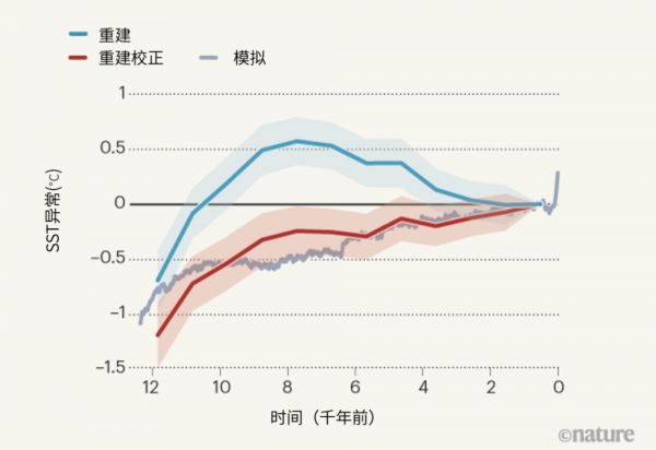 图1 | 校正气候重建中的季节性偏差。科学家可以从地质记录中重建全新世(目前的间冰期,始于11700年前)期间的全球平均温度。这些重建数据(蓝线)显示,海表温度(SST)在10000至6000年前达到顶峰后下降,直至后工业化时期,温度再度开始上升。但是,全新世SST的计算模拟与这些重建不匹配。这可能是因为地质记录具有季节性偏差——记录反映的是季节性温度的变化,而不是年平均温度。Bova等人[4]报告了一种量化和校正海洋地质记录中季节性偏差的方法,并用它来估算年平均SST(红线)。校正后的数据与计算模拟结果相符,从而解决了该领域的一个长期存在的难题。SST显示为异常:参考时间间隔的SST与0到1000年前的平均SST之差。阴影区域代表一个标准误差的范围。