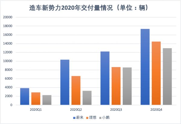 根据财报,2020年第四季度,三家造车新势力的交付量都创下了新高,环比增长均超过4成,理想的增长最快,增幅甚至将近7成。